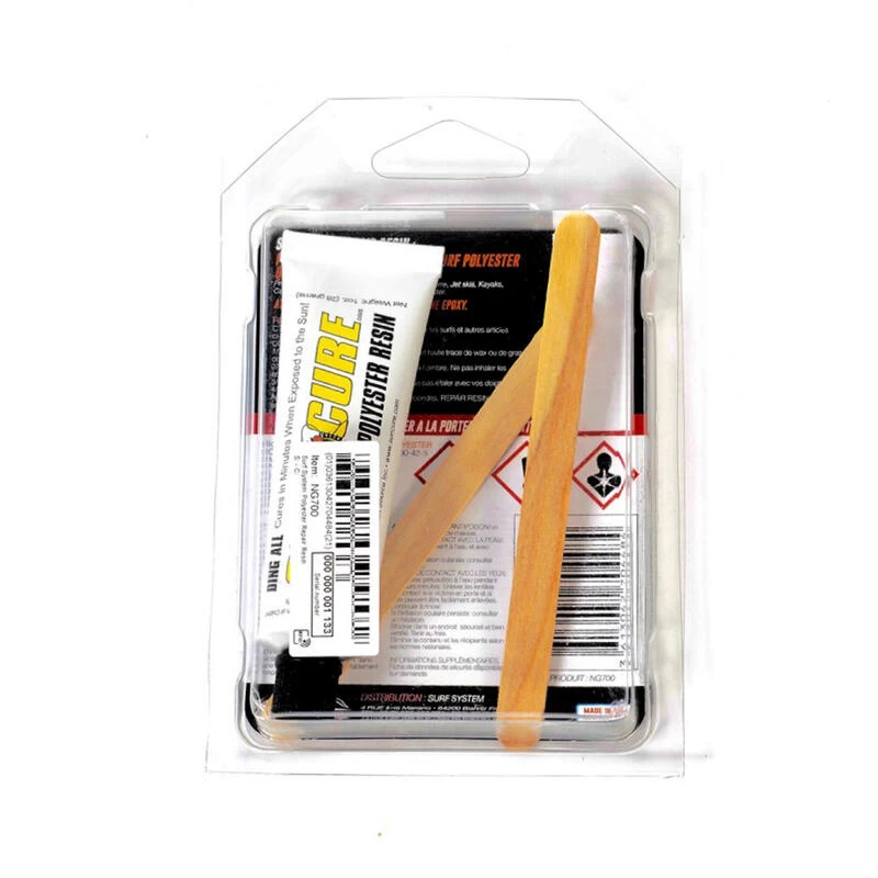 les petites réparations de planches de surf en résine polyester.Un kit de réparation compact pour planches de surf en résine polyester. Facile à utiliser car le durcissement de la résine se fait juste en exposant la planche aux UV.